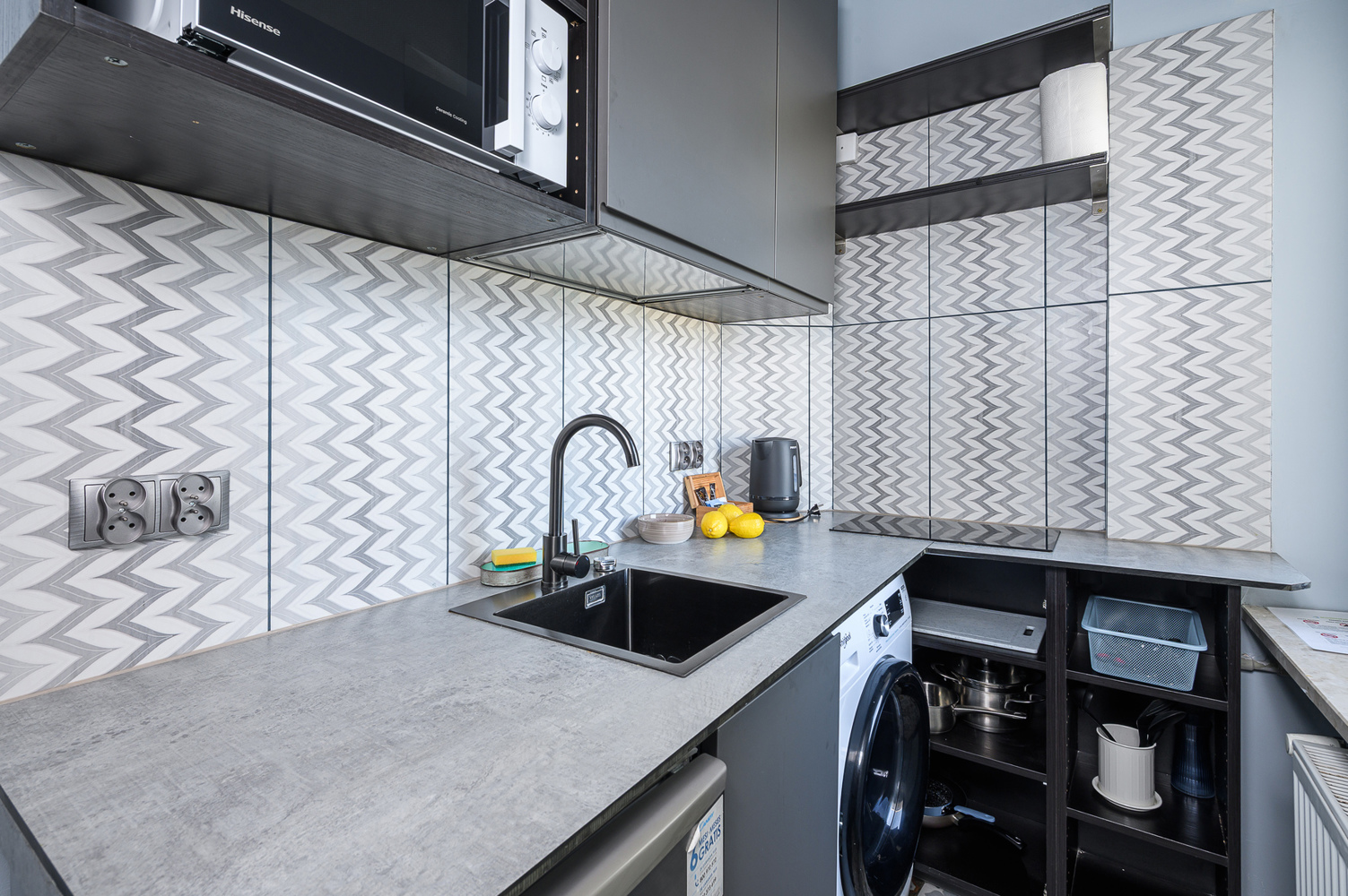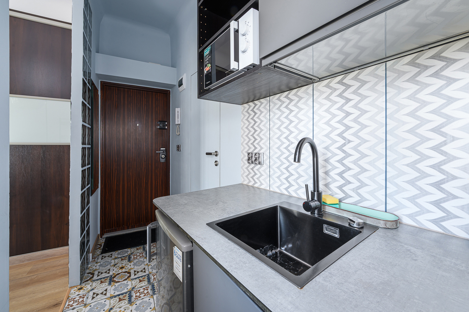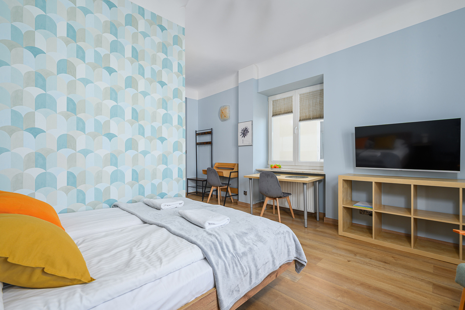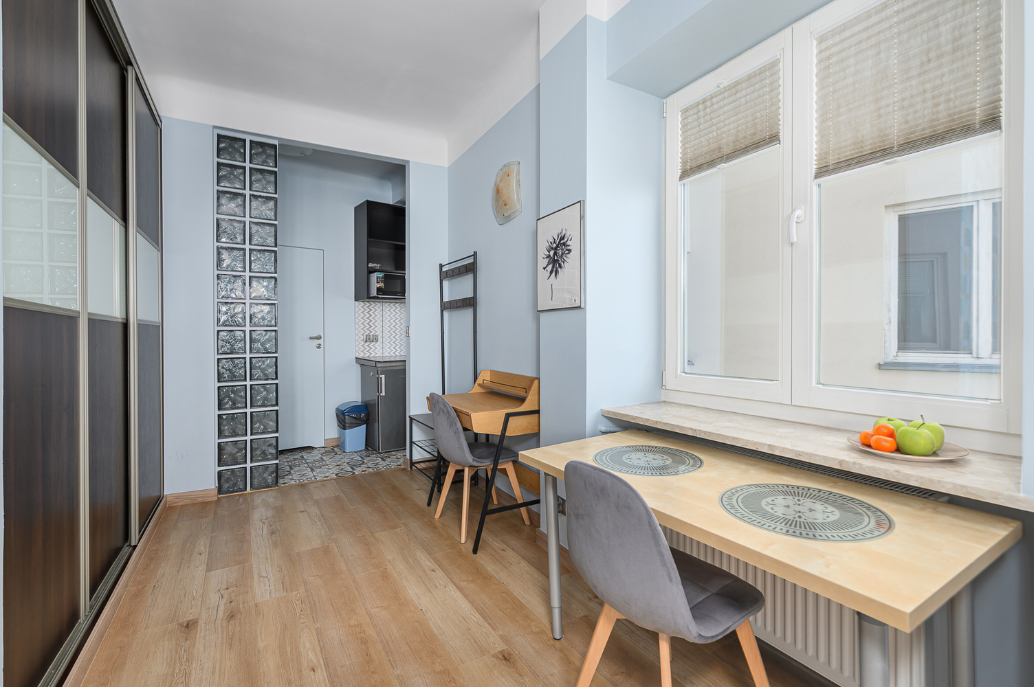 Apartament został zaprojektowany z myślą o wygodzie i funkcjonalności. W przestronnym pokoju znajduje się duże łóżko, komfortowa strefa wypoczynkowa z fotelem i telewizorem oraz biurko idealne do pracy zdalnej, co czyni go świetnym wyborem dla osób podróżujących służbowo. Dodatkowo do dyspozycji jest stół z krzesłami i pojemna wbudowana szafa. Kuchnia jest w pełni wyposażona: lodówka, płyta kuchenna, pralko-suszarka oraz kompletny zestaw przyborów kuchennych pozwalają na komfortowe przygotowanie posiłków. W łazience znajduje się prysznic, umywalka z lustrem oraz toaleta. Ze względu na zabytkowy charakter budynku, odbiór klucza odbywa się bezpośrednio obok obiektu.