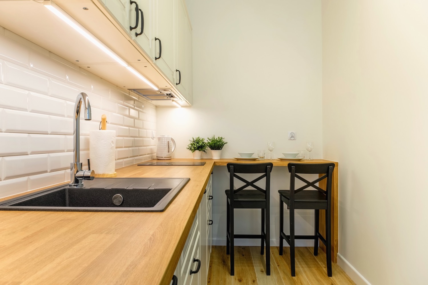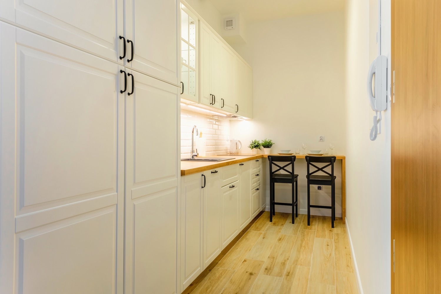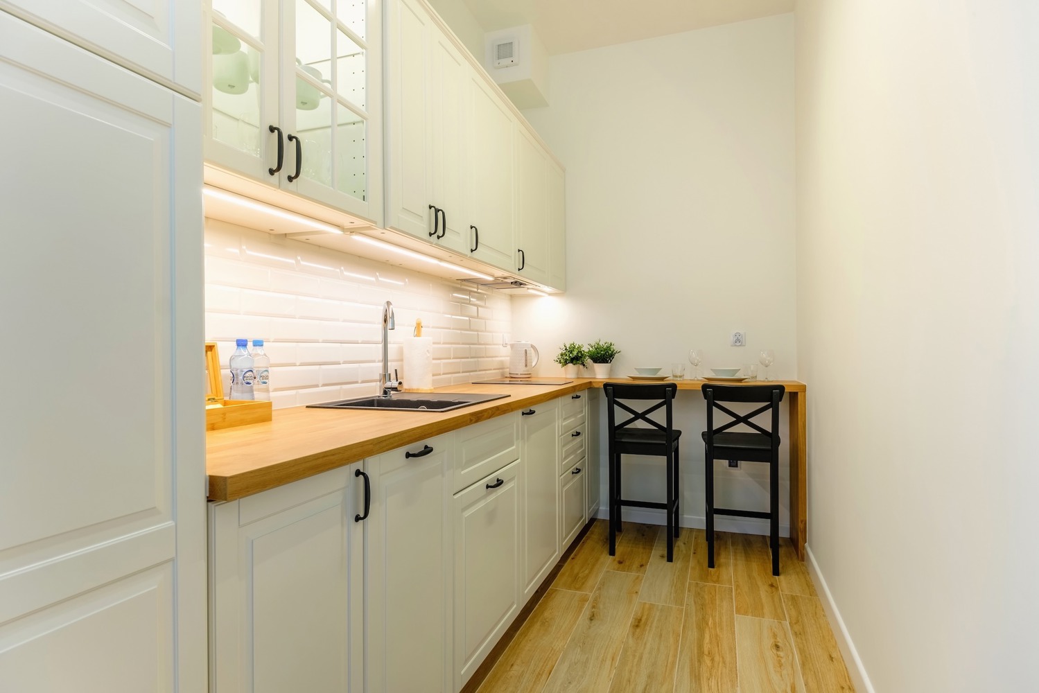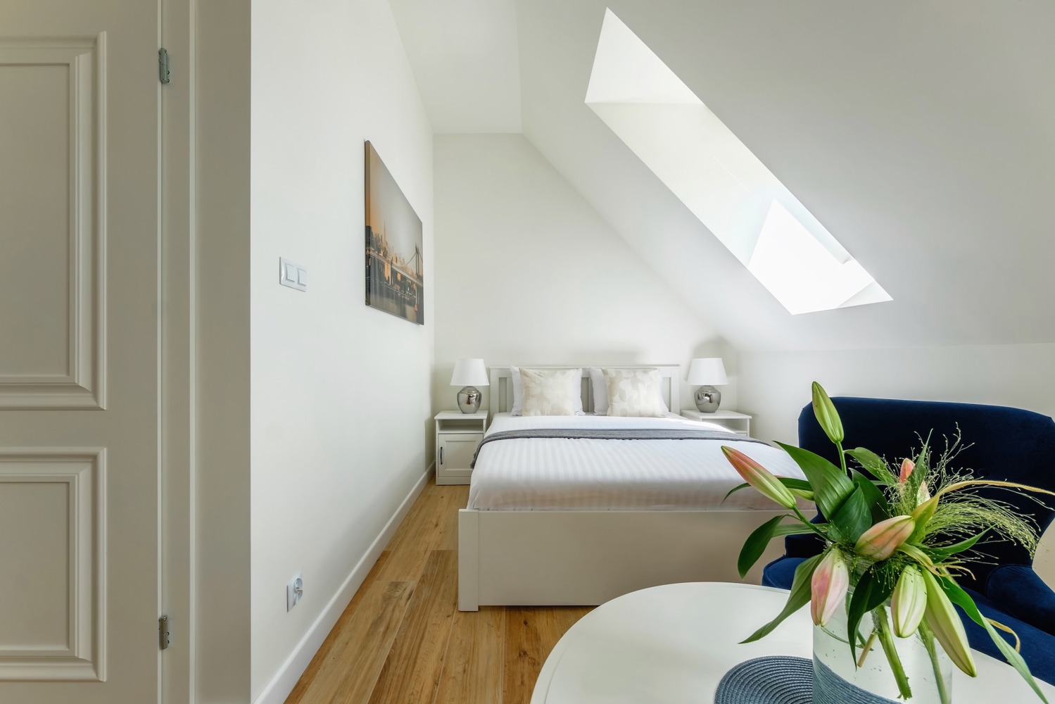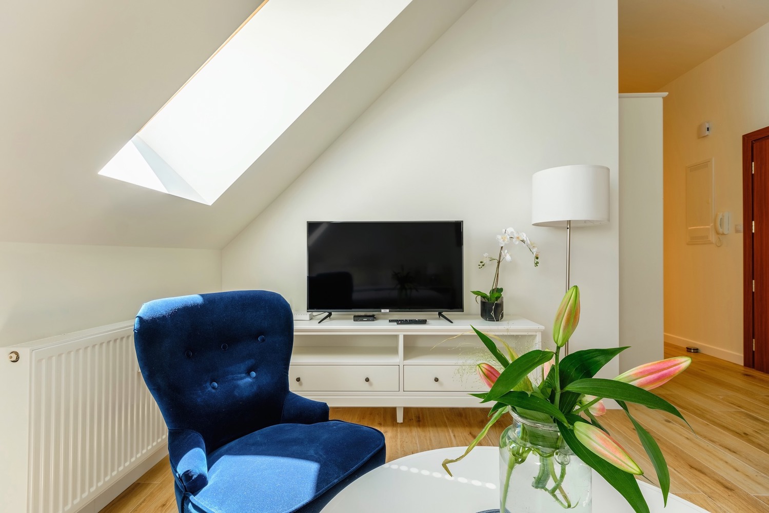 Apartament składa się z jednego pokoju z kuchnią oraz łazienki. Jego całkowita powierzchnia to 29m2. Kuchnia jest wyposażona w zmywarkę, płytę indukcyjną, mikrofalówkę, czy ekspres do kawy. W części sypialnianej znajduje się duże, wygodne łóżko oraz telewizor z płaskim ekranem, a także fotel wypoczynkowy. Łazienka została wykończona w jasnych tonach marmuru i wyposażona w prysznic typu walk-in. Całość dopełniają detale - ciepłe oświetlenie i starannie dobrane dodatki - tworzące przytulną, spokojną atmosferę idealną do wypoczynku po dniu zwiedzania Lublina.